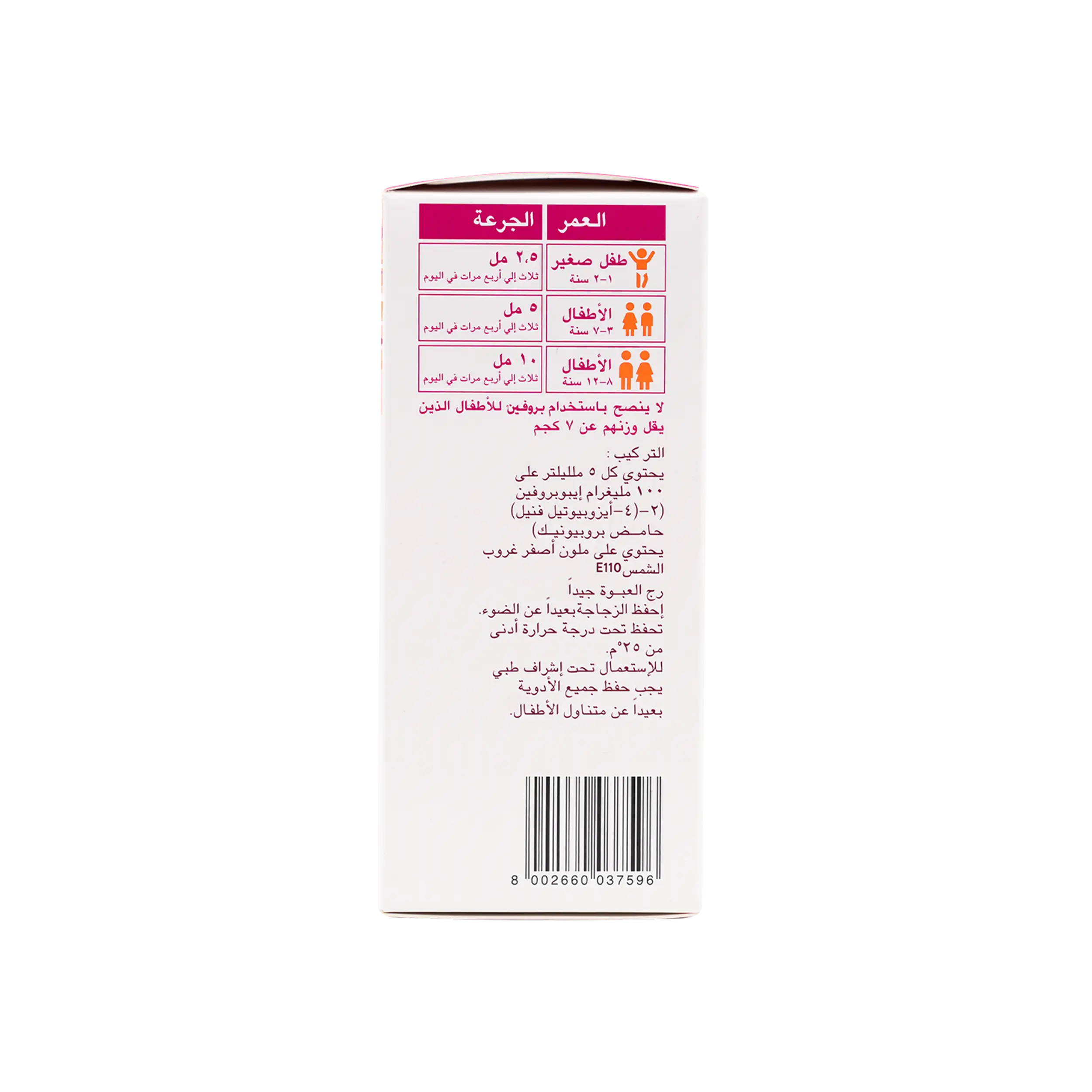 Main Active Ingredient & Its Benefits: • Ibuprofen (100mg/5ml): A well-known NSAID that helps reduce fever, inflammation, and pain by blocking the body’s production of prostaglandins, the chemicals responsible for pain and swelling.