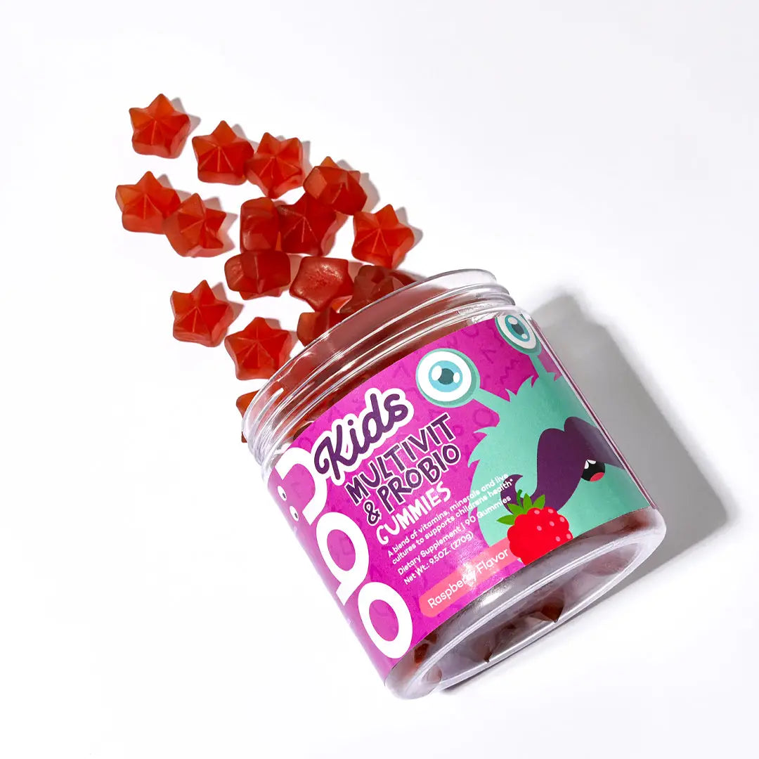 A delicious raspberry-flavored multivitamin and probiotic gummy designed for kids, promoting overall health, digestion, and immunity with a fun and easy-to-consume format.