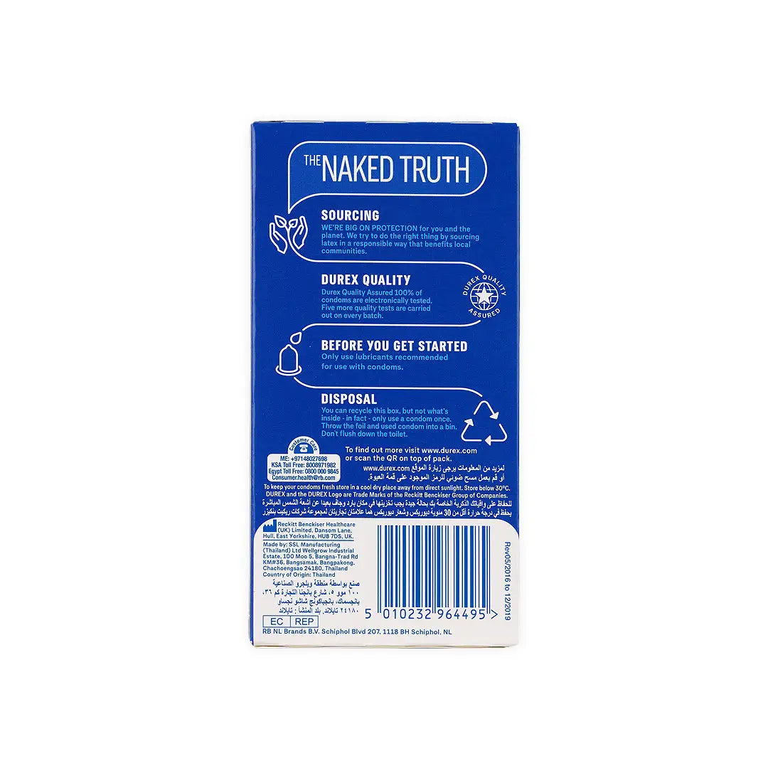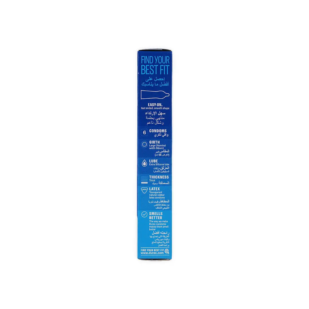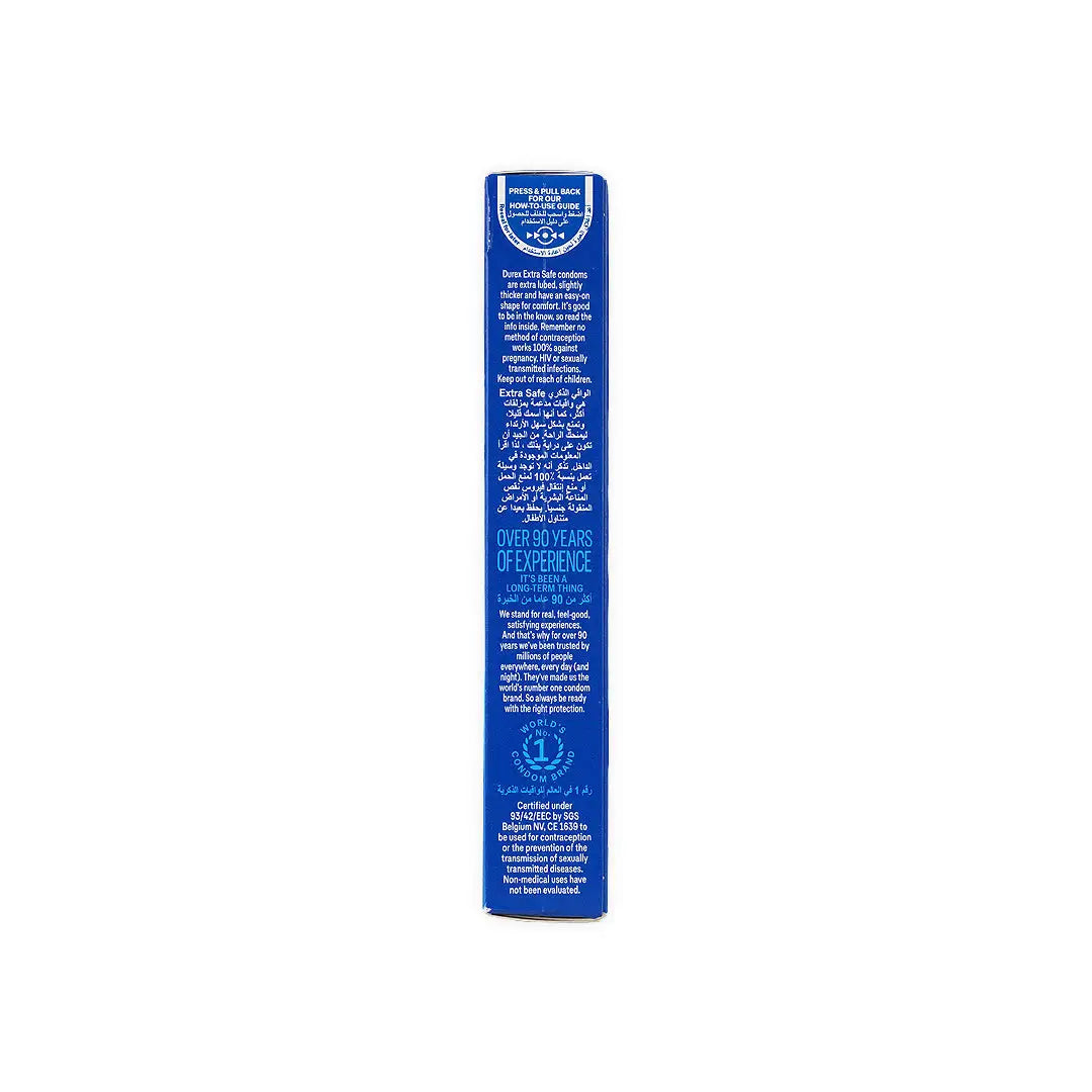 واقي Durex Extra Safe شفاف، وأكثر سمكًا قليلاً، ومزلق بشكل إضافي ليمنحك الطمأنينة والراحة المثالية، حتى تشعر بحرية الاسترخاء والاستمتاع بالجنس الرائع مع راحة البال بأنك محمي. سمات: • العرض: 56 مم • الشكل: سهل الارتداء، نهاية الحلمة، شكل ناعم. • السُمك: سميك. • اللون: شفاف. • المادة: الواقيات الذكرية المصنوعة من المطاط الطبيعي. نقاط الاهتمام: • الواقيات الذكرية المزلقة. • لا توجد وسيلة لمنع الحمل يمكنها أن توفر لك حماية بنسبة 100% ضد الحمل أو الإصابة بفيروس نقص المناعة البشرية أو الأمراض المنقولة جنسياً. • استخدم الواقي الذكري مرة واحدة فقط.